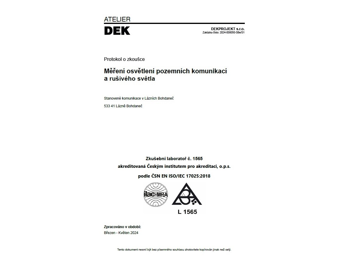 Měření veřejného osvětlení v Lázních Bohdaneč se zaměřilo na 18 úseků pozemních komunikací dle ČSN EN 13201, včetně kontroly funkčnosti svítidel. Termín měření závisel na počasí a kapacitě laboratoře, přičemž objednatel poskytl mapy a popis regulace systému.