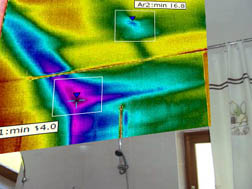 Termografie a blower door test dvou apartmánových domů, u nichž se v zimních měsících objevovaly na podhledu vlhkostní vady. Měřením byly zjištěny příznivé hodnoty průvzdušnosti (1,4 a 2,4 1/h), současně ale termovizí při podtlaku byly lokalizovány výrazné nedostatky v těsnosti střechy. Ostatní konstrukce byly poměrně těsné.