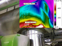 Zařízení pro technologické využití biomasy se dvěma tlumiči výfuku na potrubích, které je umístěno v hale (bez zatížení povětrností). Majitel si sám prováděl bodové měření na površích výfuků a zjisti, že na jednom z výfuků je povrchová teplota výrazně vyšší. Tato domněnka se potvrdila termovizním měřením, které umožnilo plošnou kontrolu.
