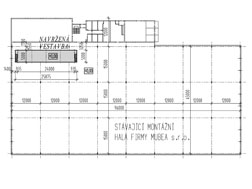 Vestavba kanceláří do výrobní haly. Vestavba je situována uvnitř dispozice haly. Pro osvětlení pracovních míst se využívá denního osvětlení procházející do interiéru přes výrobní část haly. Intenzita tohoto osvětlení byla nedostatečná a proto byly navrženy střešní světlíky.