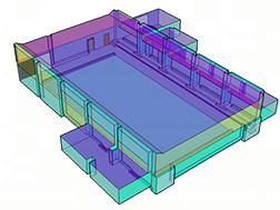 Modernizace plaveckého bazénu ve Vědomicích. Na základě průzkumu a kalibračního měření na místě byl vytvořen výpočtový model v programu ODEON. Pro posuzovaný prostor byl proveden návrh opatření ke zlepšení prostorové akustiky a splnění normových požadavků na dobu dozvuku.